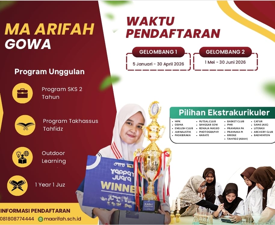 Bagi siswa MA Arifah yang telah mengikuti TKA, sertifikatnya dapat di download DI SINI Related posts:MA Arifah Berasama dengan Pokjawas Lakukan Supervisi Terpadu untuk GuruMadrasah Arifah Bersiap Gelar Raker, Bahas Pengembangan di Usia ke-7MA Arifah Gowa Rencanakan Pembukaan Kelas Riset Navigasi pos “Pilih dengan Hati, Tanggung Jawab Besar: Sekolah Tegaskan Konsekuensi Serius Mengundurkan Diri dari SNBP” MA Arifah Gowa Rencanakan Pembukaan Kelas Riset